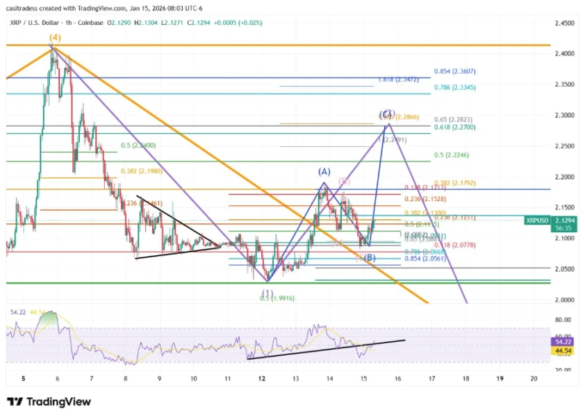 Berdasarkan grafik 1 jam, CasiTrades menjelaskan bahwa penurunan harga XRP ke area $2,03 dalam 48 jam terakhir merupakan bagian dari gelombang B yang lebih dalam dari perkiraan awal.
