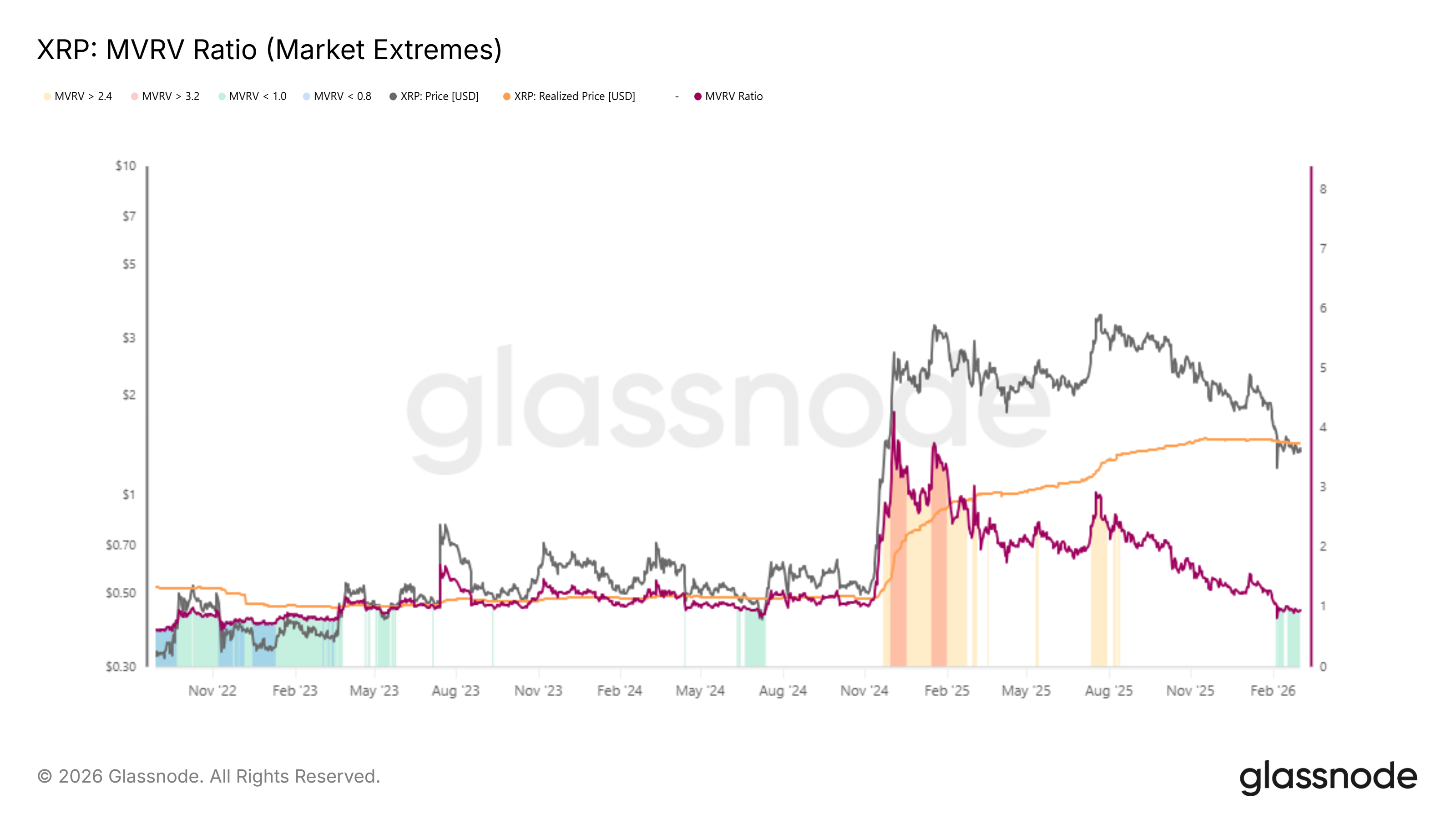 Data menunjukkan rasio MVRV XRP berada di bawah level 1,0 sekitar 15% dari hari perdagangan. Kondisi ini sering dianggap sebagai tanda bahwa aset berada dalam kondisi undervalued, tetapi juga mencerminkan lemahnya momentum pasar.