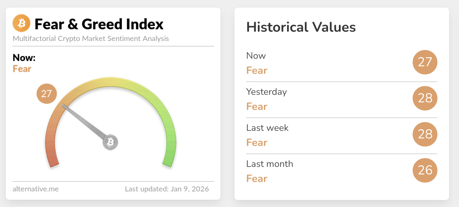 Kondisi pasar secara umum mencerminkan ketidakpastian yang tinggi. Indeks Ketakutan & Keserakahan (Fear & Greed Index) Kripto tercatat di level 27, mengindikasikan dominasi sentimen “fear” di kalangan investor. Padahal, indeks sempat naik ke level 55 pada awal pekan, namun gagal mendorong reli lanjutan dan justru berujung koreksi harga.