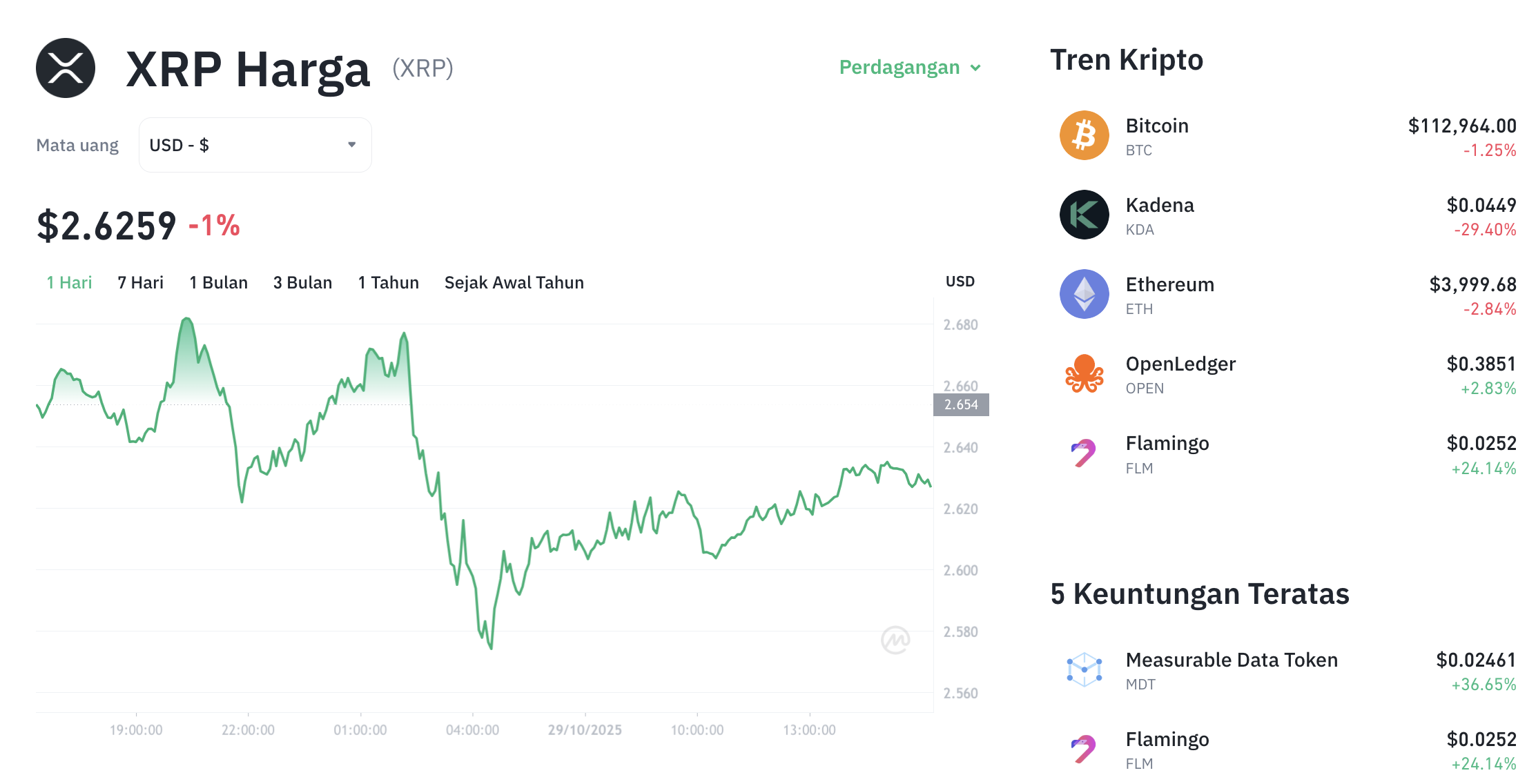 Harga XRP sempat menunjukkan sinyal penguatan di atas $2,60, namun kegagalan menembus level $2,65 membuat token ini kembali rentan terhadap tekanan jual. Pergerakan harga menunjukkan bahwa momentum bullish mulai kehilangan tenaga, sehingga reli jangka pendek berisiko terbatas.