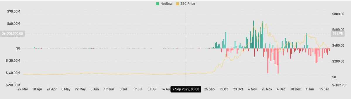 Data on-chain periode September 2025 hingga Januari 2026 menunjukkan perubahan pola arus token di bursa. Saat harga ZEC menembus $700 pada awal November, arus masuk ke bursa meningkat, kondisi yang kerap dikaitkan dengan persiapan aksi jual.